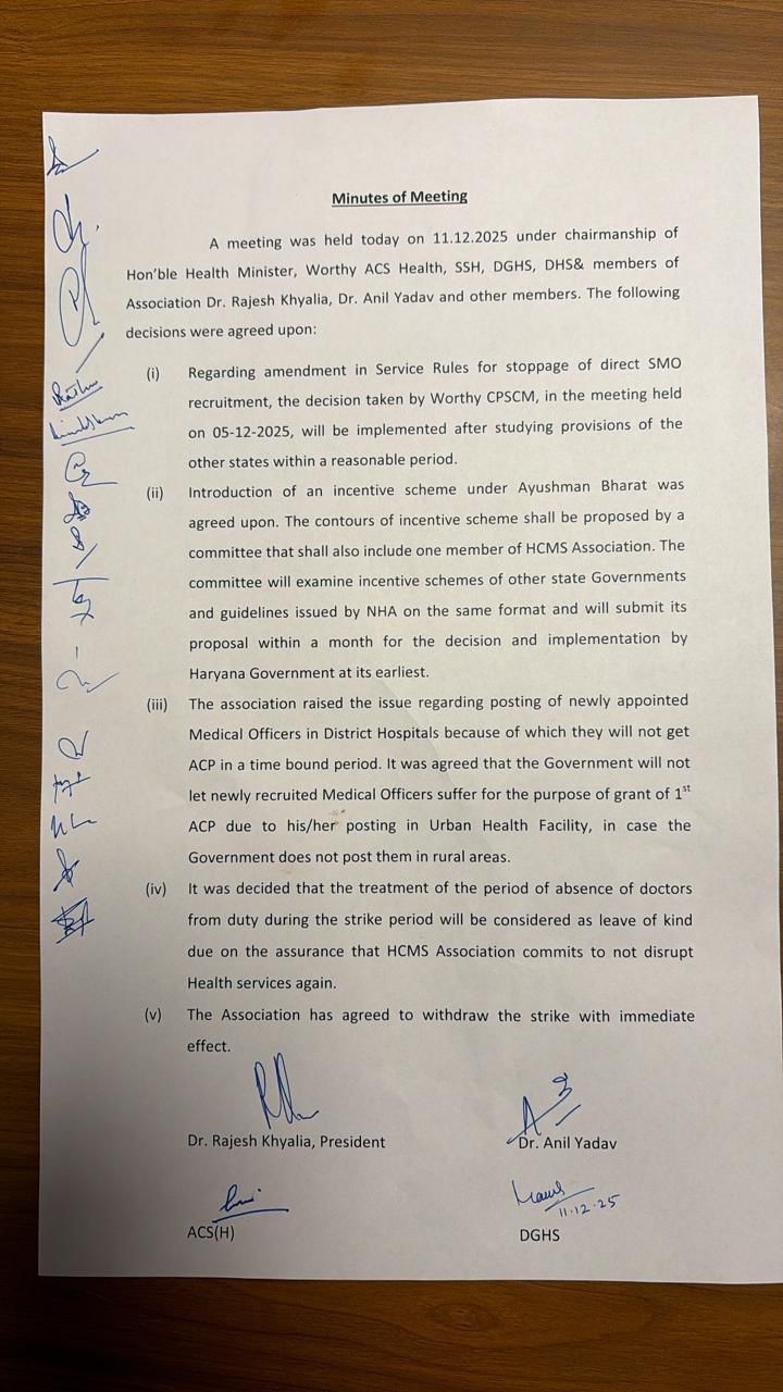 हरियाणा स्वास्थ्य विभाग और HCMS एसोसिएशन के बीच बनी सहमति