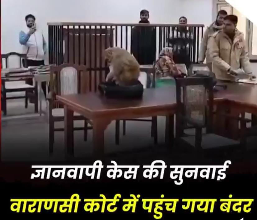 दरअसल शनिवार को वाराणसी की डिस्ट्रिक्ट कोर्ट में ज्ञानवापी कैसे की सुनवाई चल रही थी इस दौरान लोग तब हैरान रह गए जब एक बंदर कोर्ट के अंदर पहुंच गया और पूरी सुनवाई होने तक वही कोर्ट बैठ रहा हालांकि इस बंदर ने किसी को किसी प्रकार का कोई नुकसान नहीं पहुंचा।दरअसल, वाराणसी जिला अदालत के एक कोर्ट रूम में बंदर पहुंचने से अफरा तफरी मच गई. ये बंदर सुनवाई के दौरान सीजेएम कोर्ट में टेबल पर तो कभी जिला जज के कोर्ट परिसर में घूमता रहा. हैरानी की बात ये है कि यह बंदर सुनवाई पूरी होने के बाद अपने आप वहां से चला गया. साथ ही बंदर ने किसी को नुकसान भी नहीं पहुंचाया. बंदर का ये कारनामा देखकर सभी 39 साल पुराने राम मंदिर से जुड़े घटनाक्रम को याद कर रहे हैं.