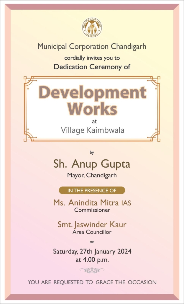 चंडीगढ़ में मेयर अनूप गुप्ता ( हालांकि मेयर का कार्यकाल 17 जनवरी को खत्म हो चुका है मगर अभी तक नए मेयर का चुनाव नहीं हुआ है ) आज 27 जनवरी को कैंप वाला में विकास के कार्य का उद्घाटन करने वाले हैं । जिसके निमंत्रण कार्ड बटते ही आम आदमी पार्टी के पूर्व अध्यक्ष की निगाहें टेढ़ी हो गई है और उन्होंने पूछा है अवैध रूप से बने हुए मेयर अनूप गुप्ता कि बिना पर इस उद्घाटन को कर सकते हैं इस उद्घाटन कार्यक्रम को तुरंत प्रभाव से रोका जाए । क्योंकि उद्घाटन समारोह आम आदमी पार्टी के वार्ड पार्षद के वार्ड में हो रहा है और कहीं ना कहीं यह आम आदमी पार्टी के पार्षद को तोड़ने की साजिश है ।