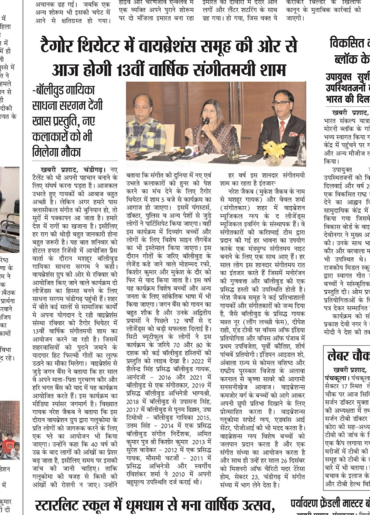 – हरियाणा राजभवन के कंट्रोलर व डायरेक्टर हॉस्पिटैलिटी जगन बैंस की एकल प्रस्तुति ” अरे दीवानों मुझे पहचानो ” और एक दो गाना वैशाली के साथ “परदेसिया ये सच है पिया” ने संगीत प्रेमियों को झूमने पर मजबूर कर दिया।