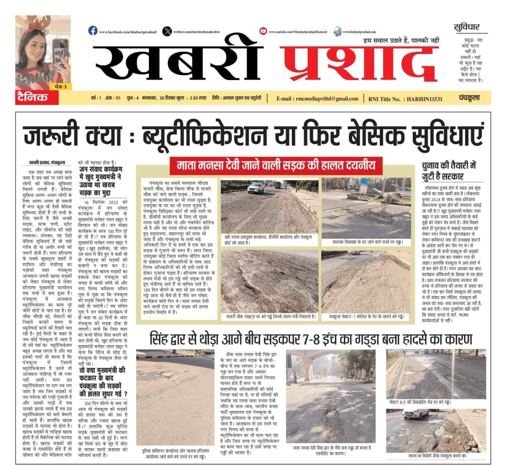 पंचकूला का सबसे व्यस्ततम चौराहा माजरी चौक, बेला विस्ता चौक से माजरी चौक को जाने वाली सड़क , जिससे उपायुक्त कार्यालय का भी रास्ता मुड़ता है, उपायुक्त के घर का भी रास्ता मुड़ता है, पंचकुला डिस्ट्रिक्ट कोर्ट भी उसी रास्ते पर है, डीसीपी कार्यालय के लिए भी मुख्य रास्ता यही है और तो और गवर्नमेंट कॉलेज भी है और यह रास्ता सीधा बरवाला होते हुए यमुनानगर, सहारनपुर की तरफ भी जाता है और पंचकूला के सभी बड़े अधिकारी दिन में या हफ्ते में एक बार इस सड़क से गुजरते भी जरूर हैं। अगर जिला उपायुक्त कोई जिला स्तरीय मीटिंग करते हैं तो प्रशासन के अधिकारियों के साथ आठ निगम अधिकारियों को भी इसी रास्ते से होकर गुजरना पड़ता है। हरियाणा सरकार के तमाम मंत्री भी इस गड्ढे भरी सड़क से होते हुए चंडीगढ़ आते हैं या वापिस जाते हैं। 100 दिन बीतने के बाद भी इस सड़क के गड्ढे आज भी वैसे ही है जैसे जन संवाद कार्यक्रम वाले दिन थे। माता मनसा देवी जाने वाली रोड पर भी सड़क की हालत दयनीय स्थिति में है।