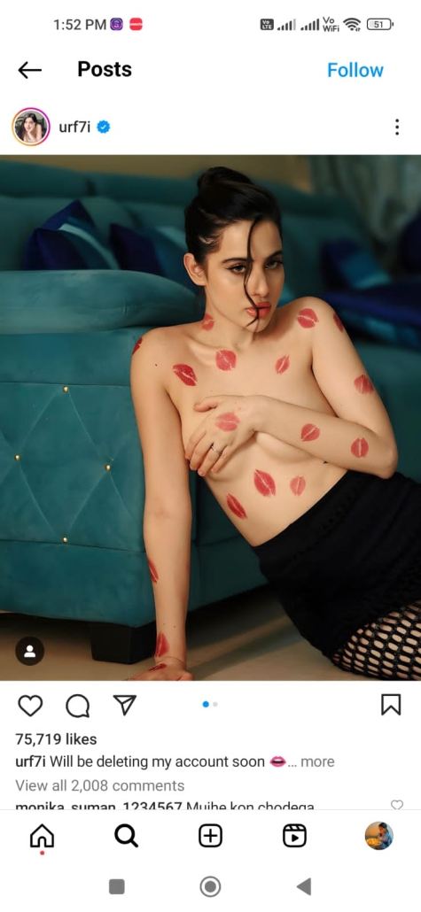 इस बार उर्फी जावेद ने बिना कपड़ों के न्यूड फोटोशूट कराया है। उर्फी ने अपनी लेटेस्ट तस्वीरें अपने इंस्टाग्राम अकाउंट पर पोस्ट की हैं। इन तस्वीरों में आप उन्हें बिना टॉप के फोटोशूट के दौरान देख सकते हैं। इस दौरान उन्होंने अपने शरीर पर केवल साबुन का पानी डाला। उर्फी ने इस फोम को लगाया और इसे ब्रैलेट का आकार दिया। उर्फी ने अलग-अलग स्टाइल में पोज दिए. इस दौरान उर्फी ने अपने बालों को ढकने के लिए बन बनाया था. मेकअप के लिए उर्फी लिपस्टिक का ही इस्तेमाल करती हैं।