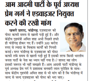 आखिर कब मिलेगा चंडीगढ़ को प्रशासक का एडवाइजर -प्रेम गर्ग
